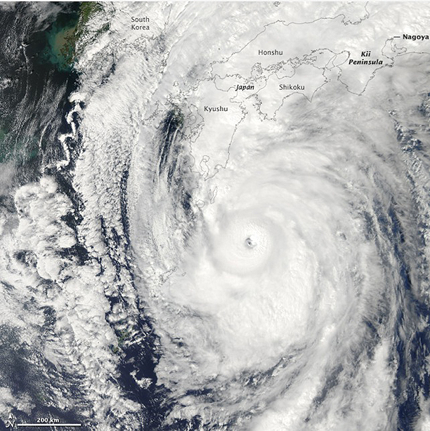 Typhoon Roke was on its way to becoming a very strong storm when the Moderate Resolution Imaging Spectroradiometer (MODIS) on NASA’s Aqua satellite acquired this image at 1:45 p.m. local time (4:45 UTC) on September 20, 2011. The storm is large and well-formed, with a distinct eye. An hour after the image was taken, Roke had winds of 176 kilometers (109 miles) per hour per hour (95 knots), making it a Category 2 storm. Seven hours later, the storm intensified to Category 4, with winds reaching 213 kilometers (132 miles) per hour ( 115 knots). Roke was moving northeast toward the Japanese island of Honshu at 35 kilometers per hour (22 miles/hour) and was forecast to come ashore on September 21, according to the Japan Meteorological Agency. Roke could bring as much as 500 millimeters (20 inches) of rain to parts of Japan.