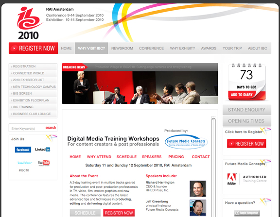 [SatNews] Future Media Concepts (FMC) now has a partnership with the International Broadcasting Convention (IBC). Working closely with the IBC organizers, FMC will bring its world-class training methodology to the industry's preeminent broadcasting event, offering the first-ever Digital Media Training Workshops for content creators and post professionals to be held from September 11th – 12th at the RAI, Amsterdam.
