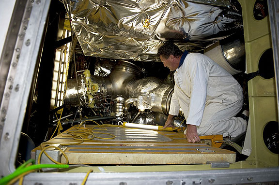At NASA Kennedy Space Center's Launch Pad 39A, a technician makes his way across a platform in space shuttle Endeavour's aft section as work begins to remove and replace the aft load control assembly-2 (ALCA-2). Photo credit: NASA/Kim Shiflett