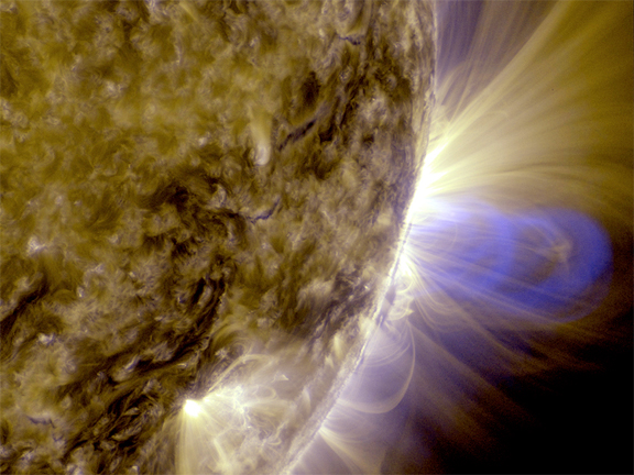 ...NASA's Solar Dynamics Observatory (SDO). It has been processed to highlight the edges of each loop to make the structure more clear. A series of loops such as this is known as a flux rope, and these lie at the heart of eruptions on the sun known as coronal mass ejections (CMEs.) This is the first time scientists were able to discern the timing of a flux rope's formation. (Blended 131 Angstrom and 171 Angstrom images of July 19, 2012 flare and CME.)