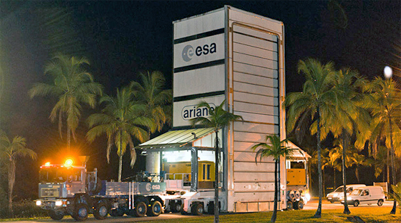 Hours before the Ariane 5’s rollout to the Final Assembly Building, EUTELSAT 25B/Es’hail 1 was moved from the Spaceport’s S1B clean room facility – having completed its pre-launch checkout – to the S5 payload preparation center for fueling. This repositioning was made by road with the large CCU3 spacecraft transportation container, which has an inflatable airtight docking seal to facilitate the relocation process.