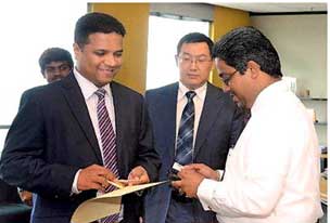 R. M. Manivannan, Chairman of SupremeSAT (Pvt) Ltd, Wang Zhongmin, Deputy Director Manager of CGWIC with Chairman, Director BoI, Esrahan De Silva at the BoI yesterday