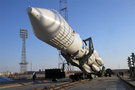 File photo of a Proton-M rocket being raised to the launch pad at the Baikonur Cosmodrome.
