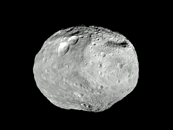 Dawn studied Vesta from July 2011 to September 2012. The towering mountain at the south pole—more than twice the height of Mount Everest—is visible at the bottom of the image. The set of three craters known as the "snowman" can be seen at the top left.