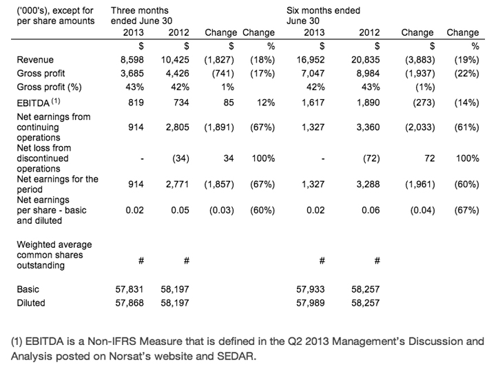 [SatNews] Norsat International Inc. (“Norsat” or “the Company”) (TSX: NII and OTC BB: NSATF) has reported financial results for the second quarter ended June 30, 2013.
