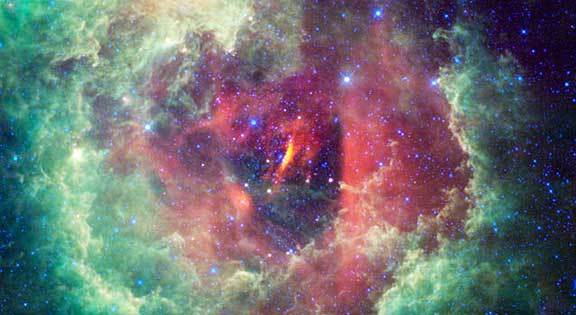 Although the Rosette nebula is too faint to see with the naked eye, NGC 2244 is beloved by amateur astronomers because it is visible through a small telescope or good pair of binoculars. The English astronomer John Flamsteed discovered the star cluster NGC 2244 with a telescope around 1690, but the nebula itself was not identified until John Herschel (son of William Herschel, discoverer of infrared light) observed it almost 150 years later. The streak seen at lower left is the trail of a satellite, captured as WISE snapped the multiple frames that make up this view. This image is a four-color composite created by all four of WISE's infrared detectors. Color is representational: blue and cyan represent infrared light at wavelengths of 3.4 and 4.6 microns, which is dominated by light from stars. Green and red represent light at 12 and 22 microns, which is mostly light from warm dust.