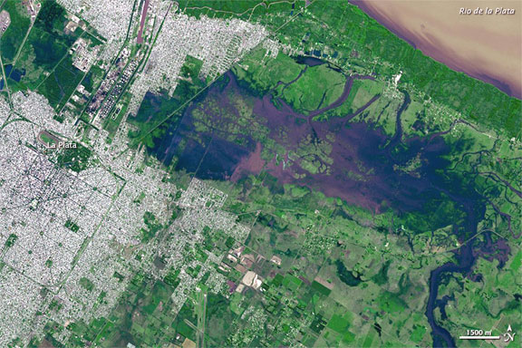Flood water lingered when the Advanced Spaceborne Thermal Emission and Reflection Radiometer (ASTER) on NASA’s Terra satellite captured this image on April 4, 2013. ASTER combines infrared, red, and green wavelengths of light to make false-color images that help to distinguish between water and land. Much of the water in this scene appears bright blue, including the broad expanse of flood water east and southeast of the city. In Rio de la Plata (upper right), water is clogged with sediment and appears beige. Vegetation is bright green and urban areas are pale blue-gray.