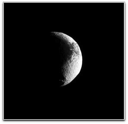 Lit terrain seen here is on the Saturn-facing side of Iapetus (1,471 kilometers, or 914 miles across). North on Iapetus is up and rotated 8 degrees to the left. Scale on Iapetus was 7 kilometers (4 miles) per pixel in the original image. The image was contrast enhanced and magnified by a factor of two to enhance the visibility of surface features. The image was taken in visible green light with the Cassini spacecraft narrow-angle camera on Sept. 13, 2009. The view was acquired at a distance of approximately 1.2 million kilometers (746,000 miles) from Iapetus and at a Sun-Iapetus-spacecraft, or phase, angle of 103 degrees.