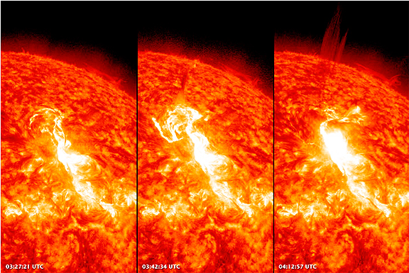 In late January 2012, our nearest star offered a preview of what may be to come in the solar maximum of 2012–13. The storm has the potential to disrupt some communications and satellite systems and to bring auroras to high-latitude skies. The images below show a solar flare as observed by the Atmospheric Imaging Assembly (AIA) on NASA’s Solar Dynamics Observatory (SDO) at 03:27, 03:42, and 04:12 Universal Time (Greenwich Time) on January 23rd. Note the brightening of the solar surface as gas was superheated and magnetically supercharged. By the third (right) image, a stream of solar material is seen flowing off into space above the hot spot, likely solar protons and a coronal mass ejection.