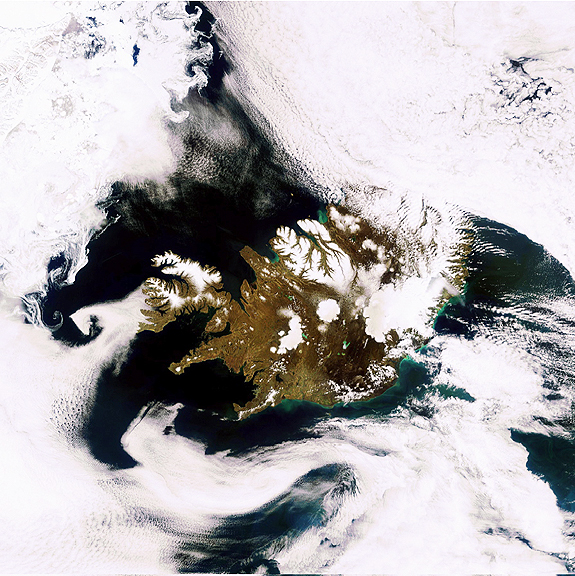 The Eyjafjallajokull volcano, which had a series of eruptions in April and May, is visible in the dark area on the southern coast. The Vatnajokull glacier (visible in white northeast of Eyjafjallajokull) is the largest in Iceland and in Europe. The white circular patch in the centre of the country is Hofsjokull, the country’s third largest glacier and its largest active volcano. The elongated white area west of Hofsjokull is Langjokull, Iceland’s second largest glacier.