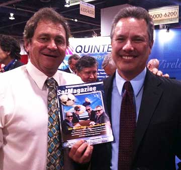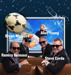 Here the cover of March SatMagazine featuring 3D comes alive with a soccer ball tearing through the TV screen and reveals Ramiro Reinoso, Senior Sales Engineer; Bryan McGuirk Senior Vice President Media Solutions; Alan Young Chief Technology Officer; and Steve Corda Vice President Market Development also seen in the photo above with Silvano.