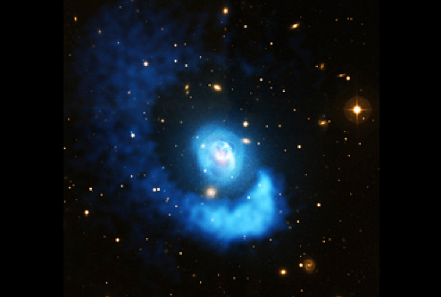 Abell 2052 is a galaxy located in the constellation Serpens, about 480 million light years from Earth. This image was captured using X-rays from Chandra X-ray Observatory and optical data from the Very Large Telescope. (Credit - X-ray: NASA/CXC/BU/E. Blanton; Optical: ESO/VLT)