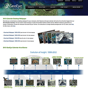 ...for viewing and download at http://www.geoeye.com/2013calendar. The calendar, designed to be used as desktop wallpaper or to be printed, features GeoEye’s top image picks as well as a few honorable mentions (including the Moon!).