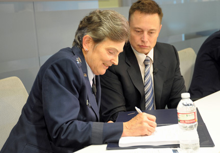 Lieutenant General Ellen Pawlikowski, SMC commander, and Elon Musk, Space X CEO, sign a Cooperative Research and Development Agreement to certify the Falcon 9 v1.1 Launch System for National Security Space missions at a ceremony, June 7. The CRADA will be in effect until all certification activities are complete. While certification does not guarantee a contract award, it does enable a company to compete for launch contracts. (Photo by Joe Juarez)