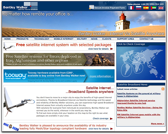 Bentley Walker also provides free satellite systems with most of their service packages, which allows the consumer to obtain the equipment at no cost — the only charge to the consumer is for the installation of the equipment. Noted has been the large number of US soldiers who club together and purchase the equipment and install it themselves with help from Bentley Walker, or, as in some cases, by experienced US communication engineers on base who charge a small fee for their expertise. Bentley Walker has sold more than 12,000 Internet satellite systems and has just received delivery of another 2,000 systems, with more orders being accepted.