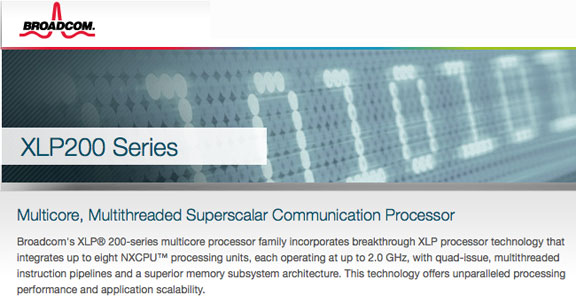 The Broadcom® XLP 200-Series, the world's first 28nm multicore communications processor family, delivers up to 400 percent faster performance than competing solutions while lowering power consumption by up to 60 percent. Providing optimum performance for data plane, control plane and heterogeneous applications, the XLP 200-Series is the only communications processor family in the industry to combine quad issue, quad threading and 2 GHz out-of-order execution capabilities with integrated networking and security acceleration— all in a single-chip solution.