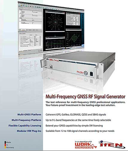 IFEN, manufacturer of GNSS navigation products and services, working in partnership with WORK Microwave, European manufacturer of advanced satellite communications and navigation equipment, today announced an enhanced version of its NavX®-NCS Professional, a multi-frequency simulator, which is optimized for research and development of GNSS safety and professional applications. The NavX®-NCS range of simulators also includes the NavX®-NCS Essential, a multi-GNSS version which is designed for system integration and production testing of mass market applications, including automotive sat-nav, mobile phone apps, chip-sets, and handheld personal navigation devices (PNDs).
