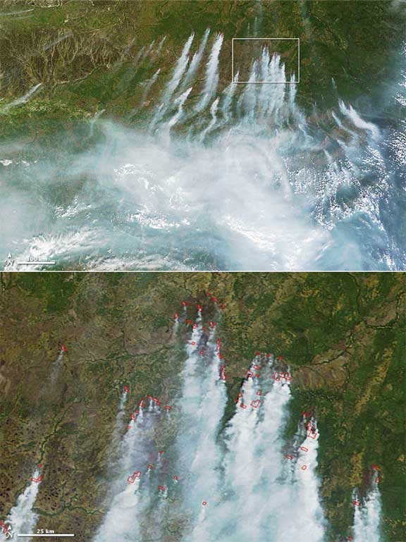 The Moderate Resolution Imaging Spectroradiometer (MODIS) on NASA’s Terra satellite acquired these images of numerous fires and heavy smoke near the borders of Khanty-Mansiisk, Krasnoyarsk, and Tomsk at 1:20 p.m. local time (06:20 Universal Time) on June 18. Active fires are shown with red outlines. Numerous fires are burning through taiga in Krasnoyarsk (bottom), and a large pall of smoke to the south covers much of Tomsk (top). According to Russian authorities, many of the fires started when people lost control of agricultural fires and campfires. However, lightning sparked some of the blazes as well.