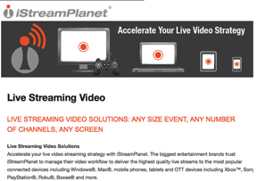 ...multiscreen, live linear streaming services for content owners, aggregators, and distributors. iStreamPlanet's live streaming workflow services have been integrated with Ooyala's platform for video streaming, analytics, and monetization to provide a best-in-class, end-to-end live streaming video solution. The comprehensive, live streaming video services provide a cost-effective and scalable solution for streaming live linear channels and live events, with a full set of features including content acquisition from practically any corner of the globe; advanced media processing including multiple-bit-rate Apple® HLS and multiple-bit-rate RTMP output; monetization including mid-roll advertising and integrated paywall services; publishing to Ooyala's modular publishing platform; ready-to-deploy cross device, cross platform players; and rich analytics that track key metrics such as viewer location, engagement, and device type.