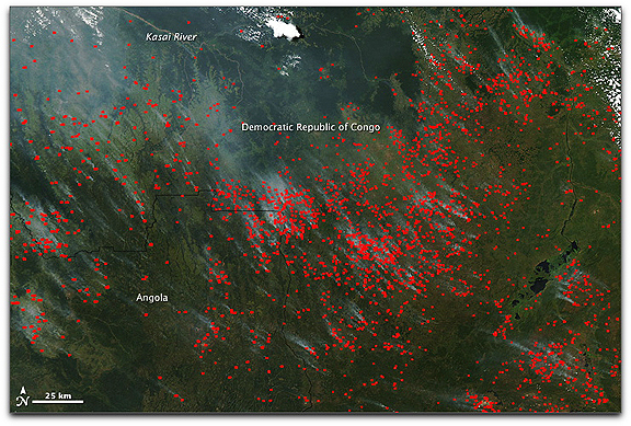 More than half of the gross domestic product (the value of all the goods and services produced by a country) of Democratic Republic of Congo comes from the agriculture sector, and fire is a pivotal part of agriculture across most of Africa. People burn crop residue to clear fields after harvest, and they burn forest and other natural vegetation to clear new land for farming. Fire is also used to drive game and grazing animals to new locations and to stimulate new growth in pastures. This annual burning has taken place for hundreds, possibly thousands of years, and it is not necessarily immediately hazardous. But it can have a strong influence on air quality and public health, as well as on climate and natural resources.