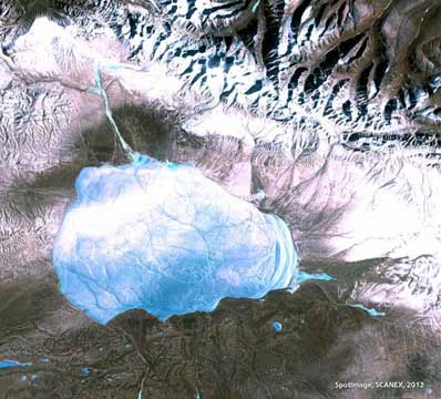 On the image: Hala Lake and the Kangze'Gyai mountain, Qilian mountain range, Haisi-Mongolian-Tibet autonomous areas, Qinghai Province, China SPOT 4 image, acquired on January 23, 2012 (SpotImage, ScanEx RDC, 2012)