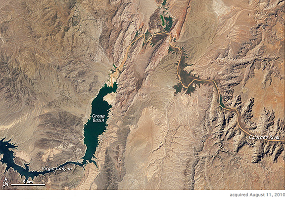 Located on the Colorado River, east of Las Vegas and west of the Grand Canyon, Lake Mead provides power and water for human activities in Nevada, Arizona, southern California, and northern Mexico. The reservoir grew up behind the Hoover Dam when it was built in the 1930s, and it can hold the equivalent of the entire flow of the Colorado River for two years. The maximum capacity of Lake Mead is 28.5 million acre-feet (35 cubic kilometers) of water, with an acre-foot equaling the amount required to cover one acre to a depth of one foot. According to records from the U.S. Bureau of Reclamation, the lake held roughly 27.8 million acre-feet of water at its high point in 1941, and levels have fluctuated through drought in the 1950s and the filling of another upstream reservoir, Lake Powell, in the 1960s. Lake levels rose steadily through the 1980s, reaching 24.8 million acre-feet in August 1985, when the bottom image was taken. But as of August 2010 (top image), Lake Mead held 10.35 million acre-feet, just 37 percent of the lake’s capacity.