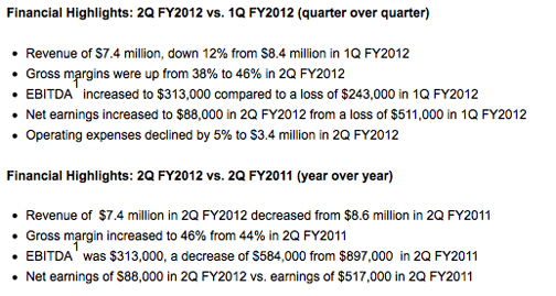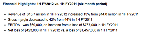 International Datacasting showed a stronger first half FY2012 compared to the same six month period in FY2011. IDC posted revenues of $15.7 million in the first half FY2012, up 13 percent from $14 million in the same period FY2011. Revenues increased by 18 percent, when excluding the impact of changes in foreign exchange from the relative strengthening of the Canadian dollar. The first half of FY2012 also showed an increase in gross margins to 48 percent in the IDC Product segment compared to 43 percent for the IDC Product segment in the first half of FY2011.