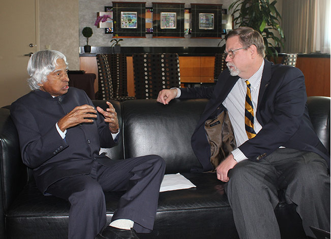 About Dr. Abdul Kalam: Despite coming from a poor background, which required him to work at an early age to supplement his parents' income, Dr. Kalam obtained degrees in Physics and Aeronautical Engineering. He was project director of India's first indigenous satellite launch vehicle. Dr. Kalam was subsequently responsible for the evolution of ISRO's (India's equivalent of NASA) launch vehicle program. From 1992 to 1999, he was the Scientific Adviser to Defense Minister of India and Secretary, Department of Defense Research & Development. Dr. Kalam was President of India from 2002 to 2007. He is known for his work with students. His 79th birthday was recognized as "World Student's Day" by the United Nations. According to a 2010 Readers Digest poll, he is one of the two most trusted men in India. Dr. Kalam has received numerous prestigious awards including the Bharat Ratna, India's highest civilian honor, and the 2013 Wernher von Braun Memorial award from the National Space Society. He currently serves as the Chancellor of the Indian Institute of Space Technology, the leading institution for producing new engineers and scientists for India's space program. Read more about Dr. Kalam at his website.