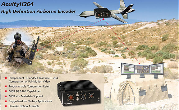 Harris Corporation (NYSE: HRS) has received Joint Interoperability Test Command (JITC) certification for its AcuityH264™ high-definition video encoder, which is the only 1920x1080 resolution video encoder to receive JITC certification — a U.S. government designation that the product has been tested to ensure interoperable, turnkey performance in demanding military applications. The Harris AcuityH264 is a compact encoder that very efficiently packages and transmits data and full-motion video for HD/SD applications. By compressing full-motion video and attaching mission data — such as telemetry and time of acquisition — the encoder significantly increases the intelligence value of the imagery. Based on ISO 14496-10 standards, the AcuityH264 is designed for use in military, aerospace, and unmanned vehicle markets.