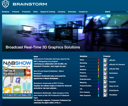 - At NAB 2011, Brainstorm Multimedia is showing EasySet12, one of the Company's latest developments within its "Easy" product family, which vastly simplifies virtual set design. EasySet12 is a simple to use, yet sophisticated and cost-effective trackless virtual set solution. It offers a comprehensive 3D real-time environment with up to four SD/HD inputs, all from just one PC. In addition to bringing in external video feeds, virtually every popular image file format can be imported, making the EasySet12 very open to the integration of external content. EasySet12 comes with an expandable library of 18 virtual sets and each one can be totally customized by modifying colors, textures, the size of objects, animating elements, inserting live video, and many other options. Visitors to Brainstorm's booth can participate in a demonstration of EasySet12, and will also have the opportunity to view live demos of Brainstorm's entire product range including the latest version of the flagship product and graphics engine eStudio V.12. Also to be featured at NAB will be the latest version of the Aston Character Generator, plus the sophisticated, template-based news graphics system BrainNews, which enables news departments to integrate Brainstorm's real-time 3D graphics into their workflow without the need for constant input from designers. Easy OnAir Graphics, includes a spectacularly intuitive toolset for live streaming of graphics based on building highly creative designs on pre-defined templates, no matter how complex they may be.