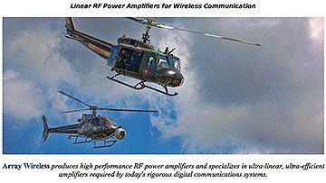 Array Wireless, Inc., a technology leader in the creation of high linearity microwave power amplifiers, today announced a major financial investment in the company by Loma Vista Wireless, Inc., and the addition of a seasoned management team to spur new growth initiatives. Click on the graphic to go to the Array website.