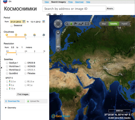 Currently, the search service provides access to the metadata archive and quicklooks received from EROS A/B, GeoEye, IKONOS, QuickBird, WorldView-1/-2, SPOT 5 and the aforementioned Pleiades-1 satellites. Space image selection and purchase are quite simple, thanks to the user friendly logic of the catalog.