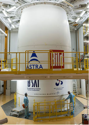 Marking another preparation milestone this week, the ASTRA 1N communications relay platform has been encapsulated in its payload fairing - completing the payload stack's upper component. This step occurred inside the satellite staging area of Ariane 5's Final Assembly Building, where the ogive-shaped fairing was lowered into place over the spacecraft and the SYLDA dispenser system. The fairing is designed to protect ASTRA 1N - which will ride as the upper passenger on Ariane 5's July 1 flight — during the heavy-lift launch vehicle's climb-out through the atmosphere's dense layers. Ariane 5's payload lift performance for the upcoming mission is more than 9,000 kg., which includes a combined mass of 8,240 kg. for its two satellite passengers, plus the launcher's dual-payload dispenser system and satellite integration hardware.