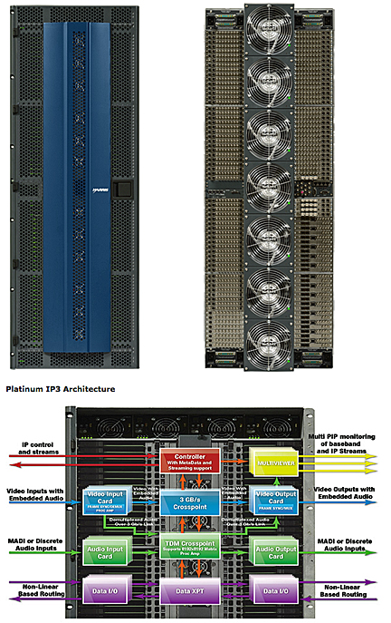 ...introduction of the Platinum™ IP3 router—the broadcast industry’s first router to accommodate separate video, audio and data paths within the same frame. The Platinum IP3 is also the first signal router that can scale to multi-frame configurations for very large broadcast and media operations using a common architecture, simplifying installations and eliminating costs associated with external components and complex cabling. The intelligent architecture maximizes on-air security, with a pioneering approach to audio, video and multiviewer signal protection based on redundant crosspoints and integrated routing designs.