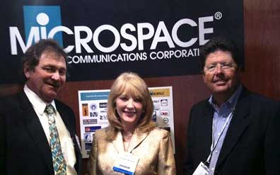 Satnews Publisher Silvano Payne meets with Bonnie Southard Manager of Video Services at Microspace, and Greg Hurt, Vice President Sales & Marketing at booth SU72222