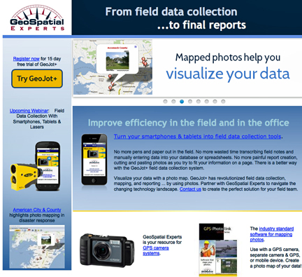 ...GeoJot+ field data collection system. A subscription-based cloud solution, GeoJot+ combines GeoSpatial Experts’ popular GPS-Photo Link photo-mapping software and GeoJot mobile app to streamline photo-based geospatial field data collection for teams of field users.