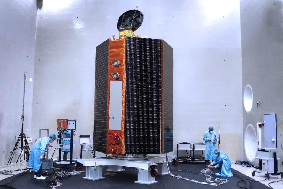 Airbus space engineers are ‘bombarding’ the latest satellite for the European environment and security program ‘Copernicus’ with sound in a dedicated chamber at the Space Test Centre of Industrieanlagen-Betriebsgesellschaft mbH (IABG) in Ottobrunn, near Munich. The acoustic noise test simulates the sound impact to which the satellite will be exposed during rocket launch.