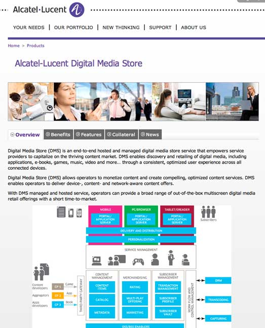 Alcatel-Lucent's Digital Media Store (DMS) enables Telenor to provide its customers with a rich blend of services and content and more from a single, cloud-based 'entertainment hub'. Instead of having to search for content in various sites that may or may not be compatible with their device, DMS provides Telenor subscribers with a one-stop shop where they can easily discover, acquire and use any content, across all their connected devices including PCs, feature phones, smartphones and tablets.