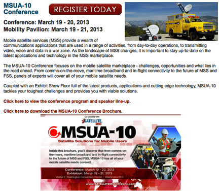 Tickets to the luncheon are included with MSUA-10 Conference registration, or can be purchased a la carte. For more information, or to register for MSUA-10, please go to www.SATELLITEMobilityZone.com.