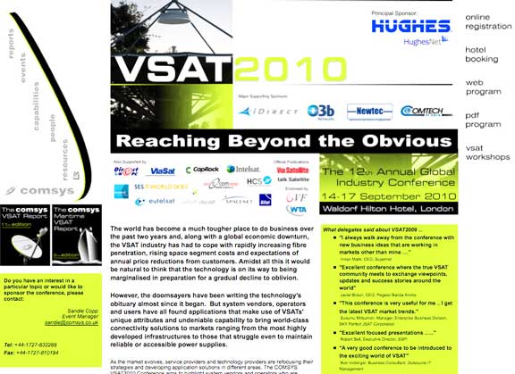 At VSAT2010, held at the Waldorf Hilton Hotel in London, the leading innovators in the VSAT market will deliver their views on the needs of customers and the development of new applications and platforms. Key industry speakers will talk about the practical aspects of providing global and regional services and address the challenges and opportunities for future growth. Segment and application specific topics:
