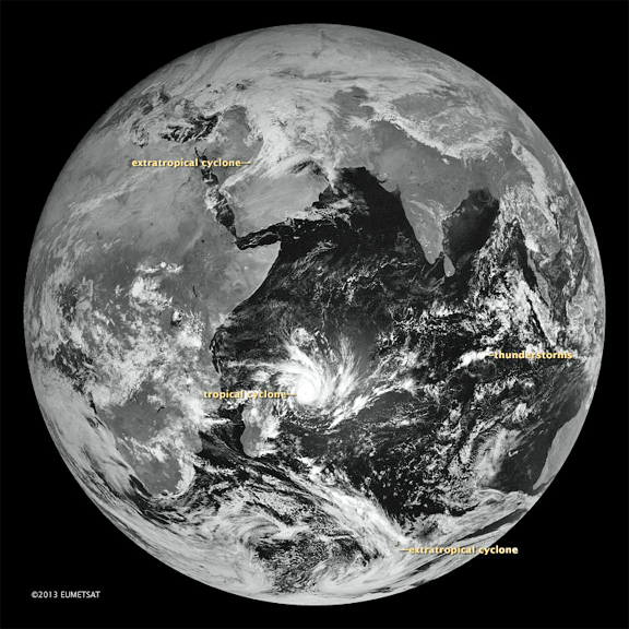 A EUMETSAT weather satellite acquired this image on January 29, 2013. It shows examples of all three types of storm. Thunderstorms are the smallest, tropical cyclones are significantly larger, and extra-tropical cyclones are the largest. In satellite imagery, the clouds of a mature extra-tropical cyclone are sprawling and comma-shaped, whereas mature tropical cyclones are spiral-shaped and often have a distinct eye at their center. Thunderstorm clouds are irregularly shaped and have towering cumulus clouds that billow upward, creating a textured appearance on the tops of clouds layers.