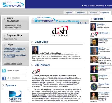 This online event will begin at 11am ET with an opening session featuring a conversation with a Federal Communications Commission (FCC) Senior Attorney about the Over-the-Air Reception Devices (OTARD) Rule. Feature presentations from satellite platform providers DIRECTV and DISH Network will provide information on newly released technologies and offerings. SBCA SkyFORUM 2010’s closing presentation will be given by the Consumer Electronics Association’s (CEA) Senior Research Analyst, Ben Arnold, and will focus on consumer perspectives on 3D and connected television.