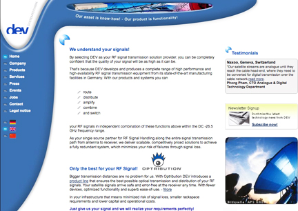 [SatNews] At IBC2010, DEV Systemtechnik presented more than 50 new products for the optical transmission, reception and distribution of RF signals in satellite communications and CATV systems.