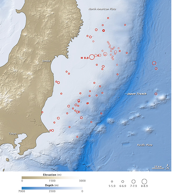 The epicenter was 130 kilometers (80 miles) east of Sendai, and 373 kilometers (231 miles) northeast of Tokyo. If initial measurements are confirmed, it will be the world’s fifth largest earthquake since 1900 and the worst in Japan’s history. This map shows the location of the March 11 earthquake, as well as the foreshocks (dotted lines) and aftershocks (solid lines). The size of each circle represents the magnitude of the associated quake or shock. The map also includes land elevation data from NASA’s Shuttle Radar Topography Mission and ocean bathymetry data from the British Oceanographic Data Center.