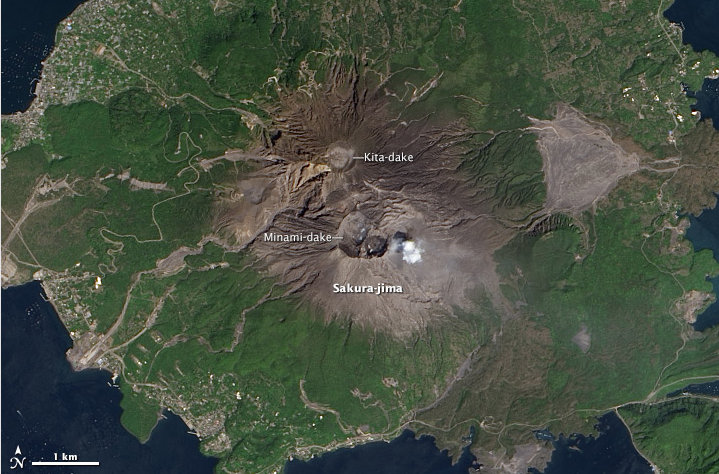 These natural-color satellite images, collected by Landsat 8, compare Sakura-jima on August 19 (a day after the eruption) to the volcano on April 13, 2013. The most visible change is a field of pyroclastic flow deposits that stretch up to 760 meters (2,500 feet) from Showa Crater. On the eastern (right-hand) slopes of Sakura-jima light-colored, intertwined channels are visible on an older flow deposit. These are likely either from erosion that revealed light, unweathered material; or fresh ash deposited by short-lived streams.