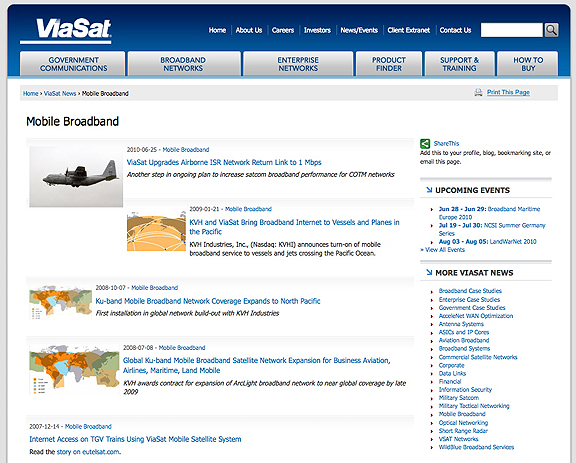 USSOCOM) was the first military organization to use the high-speed Ku-band network on its C-130 aircraft. The small C-130 terminal attaches to the aircraft emergency escape hatch, so that operators can configure an aircraft for specific missions within a few minutes, without any permanent aircraft alterations. Now a number of aircraft are tapping into the network. ViaSat mobile broadband installations now total over 800 systems. Applications include a mix of systems operating on integrated networks for general aviation, COTM, maritime, and high-speed rail. The terminals use ViaSat patented