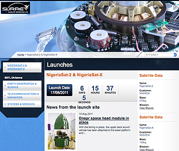 SSTL has announced it will launch the NigeriaSat-2 and NigeriaSat-X satellites on behalf of the Nigerian National Space Research and Development Agency (NASRDA) by a Dnepr launch vehicle from Yasny, Russia , on August 17th, 2011. Both NigeriaSat-2 and NigeriaSat-X will be launched into the Disaster Monitoring Constellation, where they will assist with disaster relief and global environmental monitoring campaigns alongside satellites from other consortium members ASAL (Algeria), BLMIT (China), Deimos Space (Spain) and SSTL (UK). A joint SSTL and NASRDA team performed the launch campaign tasks in Yasny, ensuring that both satellites are healthy and ready to launch. SSTL Executive Chairman, Sir Martin Sweeting, will accompany a delegation of 12 Nigerian ministers and NASRDA head, Dr S.O. Mohammed, for the historic launch. Both satellites will significantly boost African capabilities for natural resource management.