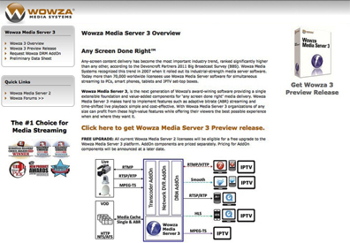 Wowza Media Systems®, the "any screen done right™" media server software company, has announced that its Wowza Media Server® 3 has made the short list of finalists in the 2011 Cable & Satellite International (CSI) Product Awards. Wowza is among seven finalists in the TV Everywhere/multi-screen video category, which is a new category this year. CSI created it as a stand-alone category to reflect the growing importance of cross-platform video services. Wowza Media Server 3 provides an extensible foundation for "any screen done right" delivery of an optimized viewing experience anywhere, anytime. Innovations in the third-generation product make features such as adaptive bit rate streaming, time-shifted playback, and digital rights management (DRM) simple and cost-effective. Specifically, Wowza Transcoder™ AddOn transforms incoming live streams from a variety of sources into multiple stream sets for H.264 adaptive bit rate delivery. Wowza Network DVR™ AddOn enables licensees to deliver live linear streams as time-shifted services. Finally, Wowza DRM™ AddOn provides secure key exchange and on-the-fly video encryption for streaming premium content to the full range of devices. Wowza Media Server 3 is a free upgrade for all Wowza Media Server 2 licensees.