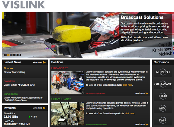....Broadcast, Surveillance and Mining as well as providing a comprehensive view of our corporate activities. The new website reflects all of the Vislink Group brands - Advent, Gigawave, Link, MRC and PMR. These comprehensive branded product ranges can now be easily accessed by clicking through the brand logos along with information on applications and solutions across the markets that the Vislink Group serves. Corporate and investor news, financial data, social media links are logically organized and easily accessible.