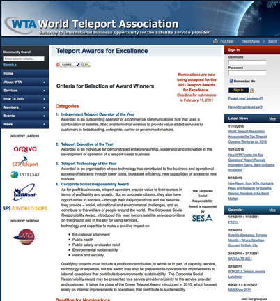 - Teleport Technology of the Year - Awarded to an organization whose technology has contributed to the business and operational success of teleports through lower costs, increased efficiency, new capabilities or access to new markets.
